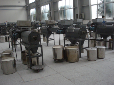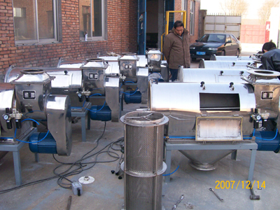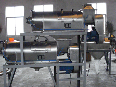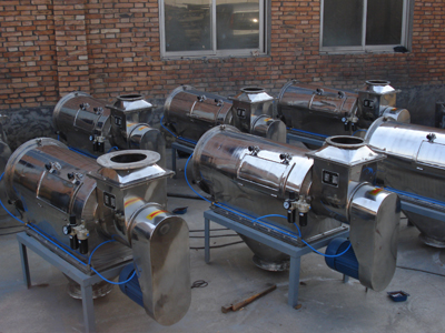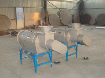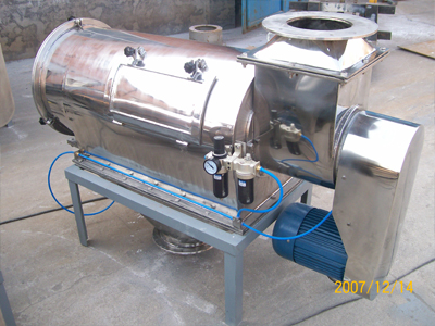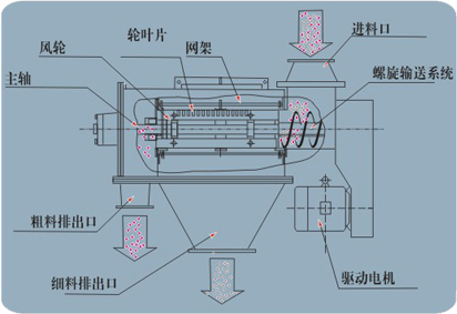 本設(shè)備篩網(wǎng)為圓筒狀,置于機(jī)體內(nèi),物料通過(guò)螺旋輸送系統(tǒng)后,和氣流混合、霧化進(jìn)入網(wǎng)筒內(nèi);通過(guò)網(wǎng)筒內(nèi)風(fēng)輪葉片使物料同時(shí)受離心力和旋風(fēng)推進(jìn)力,從而迫使物料噴射過(guò)網(wǎng),由細(xì)料排出口排出,不能過(guò)網(wǎng)的物料沿筒壁從粗料排出口排出。